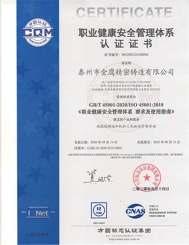 泰州金鹰-职业健康安全管理体系证书